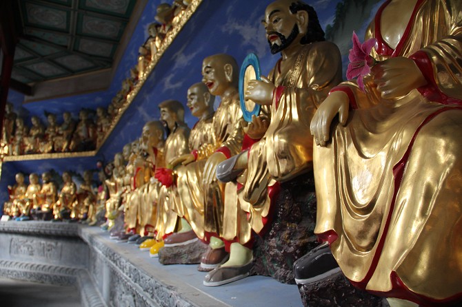 殿內(nèi)回廊中有大型群像“釋迦牟尼講經(jīng)會(huì)”,五百羅漢姿態(tài)各異,造型生動(dòng),他們或在山林之中,或在小橋流水間,或坐或臥,或仰頭,或俯首,形態(tài)逼真,情趣無限,堪稱藝術(shù)杰作。