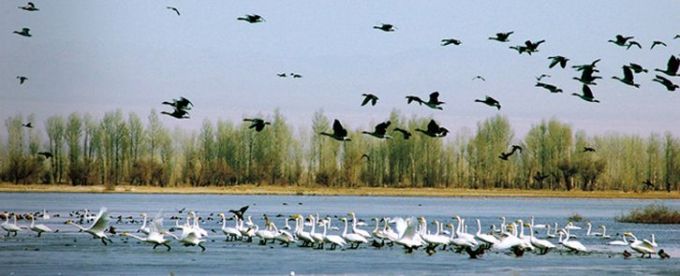 再往前走,不遠處,就是候鳥放飛基地了。大學時期,有個朋友說,東北是天鵝的聚集地,那里的天鵝潔白美麗,總是拍打著健美的翅膀,在夜幕來臨時,向著夕陽飛翔,好像是圣潔的精靈。我喜歡天鵝,也憧憬著有一日能一睹她們的風采,沒想到,今天我就有幸和她們來了一次親密接觸。當體態(tài)優(yōu)美的天鵝在我眼前騰空而起時,天空仿佛變成了一個大舞臺,而天鵝,則用雙翅,在這一幅幅壯麗的自然畫卷中,留下了自己來過的痕跡。
