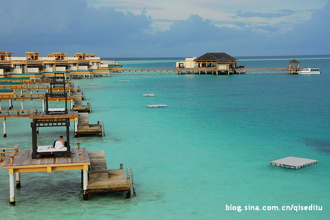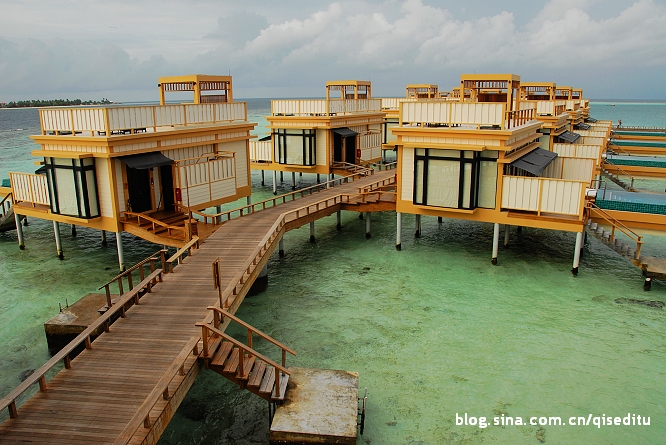 這就是維拉瓦魯?shù)乃衔萘?,通過一條木板走廊鏈接在一起,遠處綠色的那一片,就是主島,俗稱海龜島