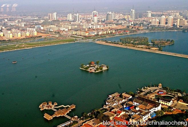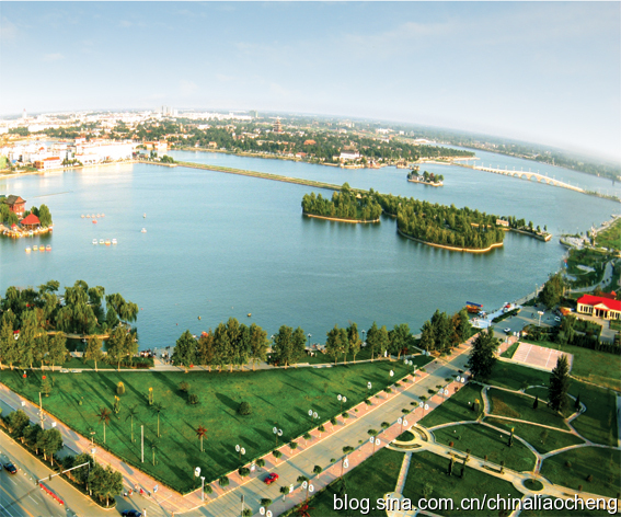 風(fēng)光秀麗的東昌湖環(huán)繞聊城古城一周,始建于宋熙寧三年(公元1070年)。當(dāng)時因修筑城墻以及護城堤挖土而成,后經(jīng)歷代開闊,現(xiàn)在面積已達6.3平方公里,與杭州西湖相當(dāng),是濟南大明湖的4—5倍。東昌湖由10個湖區(qū)和20塊水面組成,湖岸線長達16千米,是中國江北地區(qū)罕見的大型城內(nèi)湖泊,她為聊城這座城市增加了靈氣,是聊城的最靚點。她以黃河水為源,積水約1680萬立方米,水深3—5米,常年不竭。東昌湖水清澈,無任何工業(yè)污染;景色宜人,令游客流連忘返,是國家釣魚基地,適宜水上游樂項目的開發(fā)與建設(shè)。