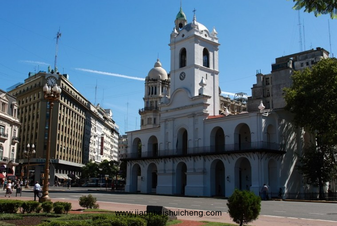 阿根廷國會大廈位于國會廣場西端,是阿根廷的立法機關(guān),大廈于1887年至1906年建成。大廈主體有4層,以白色大理石裝飾墻面,帶雕飾的希臘式立柱環(huán)繞整個建筑。大廈正中高高聳起一座穹頂塔樓,塔身半腰處,一輛青銅四架馬車凌空欲飛,最高處是直徑20米的青銅穹頂。建筑的氣勢與精美,不輸于華盛頓的國會大廈。屹立在大廈前面的兩會紀念碑氣勢宏偉,工藝精美。