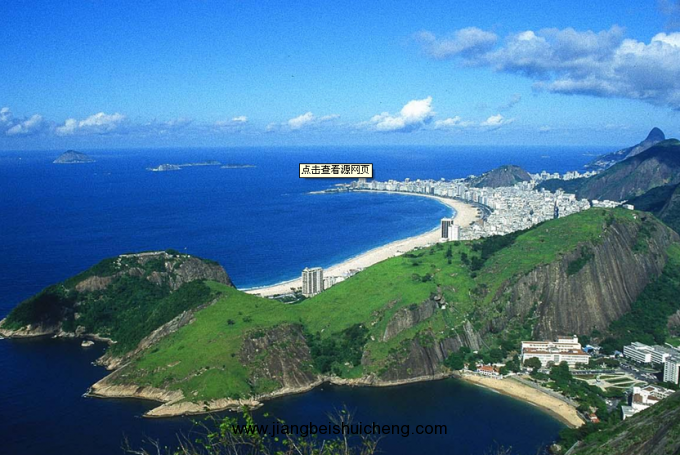 遠(yuǎn)處,一條長龍飛架海灣兩岸,那是著名的尼泰羅伊大橋。這座大橋全長十四公里,把里約與對岸的尼泰羅伊市連結(jié)在一起;這一邊是浩如煙海的大西洋,波光粼粼的海面上不時地駛過巨大的海輪,三三兩兩形狀各異的小島在海浪潮水的拍擊下,時隱時現(xiàn)。遠(yuǎn)處,科帕卡巴納海灘像一彎新月,橫臥在大西洋身旁,五顏六色、南來北往的小汽車宛若無數(shù)的甲殼蟲在月牙般的海濱大道上緩緩爬行……