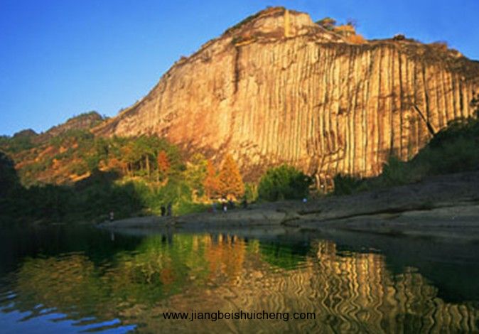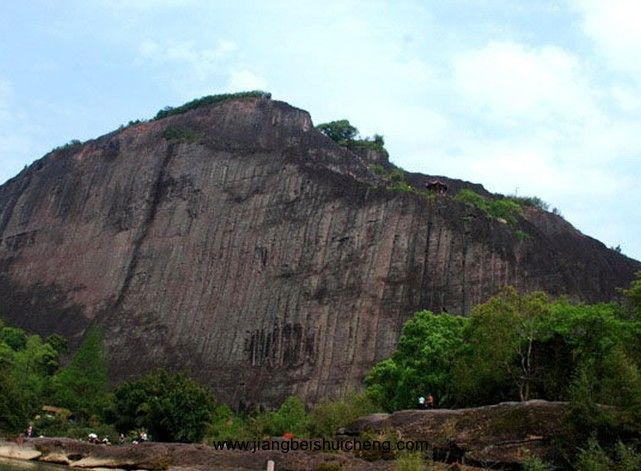 仙掌峰,在六曲,巨石渾然一體,上有痕跡如掌印,因名。又似匹匹白練自峰頂垂下,故又名曬布巖。每當夕陽西斜,奇峰倒映水中,如萬丈垂練隨風(fēng)飄灑,極富神韻,此峰有許多景點,被辟為天游景區(qū)。傳說:曬布巖半壁有幾道深深的痕跡,如同紅潤的掌印,相傳這是仙人留下的。在很久以前,九重天上的織婦女,每天都要背著錦囊,唱著歌兒去采集五彩云錦,配上一縷縷金絲銀線,織成一匹匹綾羅綢緞,獻給王母娘娘。一天早晨,負責挑擔送布的赤腳大仙,挑著云錦來到武夷山,被神奇的碧水丹山迷住,便放下?lián)尤ビ瓮?。等他聽到天宮的擊鼓聲時,才想起錦擔,一看糟了,版權(quán)所有山東聊城聊之旅國際旅行社有限公司,轉(zhuǎn)載必究!綾羅綢緞已被晨露打濕。于是,他把一匹匹錦抖天,曬在巖壁上,一直垂到六曲溪邊。大仙用手將錦緞?chuàng)岬闷狡秸?,沒想到紅日高照到中了午,錦緞被曬化了,溶進了光滑的巖壁里,就連大仙按云錦的手印也留在了巖壁上。
