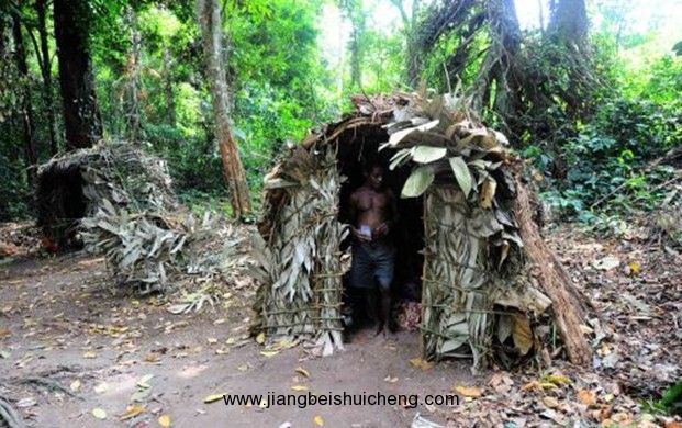 一刻鐘后,我們來到了一塊林中空地。只見芭蕉和芒果樹圍繞的空地上蓋有三五茅舍,幾個手持梭鏢的卑格米人已經(jīng)在路口相迎。他們有的赤膊,有的穿T恤;他們果然長得很矮,最高的大概也只有1米40左右,大部分都是1米30左右。他們挺胸凸肚,走起路來好像都有點外八字,連肚臍眼都特別向外突出。那些茅舍都是用樹枝、藤蔓、樹皮和樹葉糊上泥土搭成的,非常簡易,好像經(jīng)不起稍微大一點的風(fēng)吹。茅舍里面空空如也,幾乎沒有什么可以稱為家具的東西。幾個婦女正坐在一個茅舍涼亭里,旁邊是一些鍋碗類的炊具,好像是剛吃了飯在聊天。幾個孩子在旁邊跑來跑去,從外表看,完全是一幅普通的民間風(fēng)俗圖。