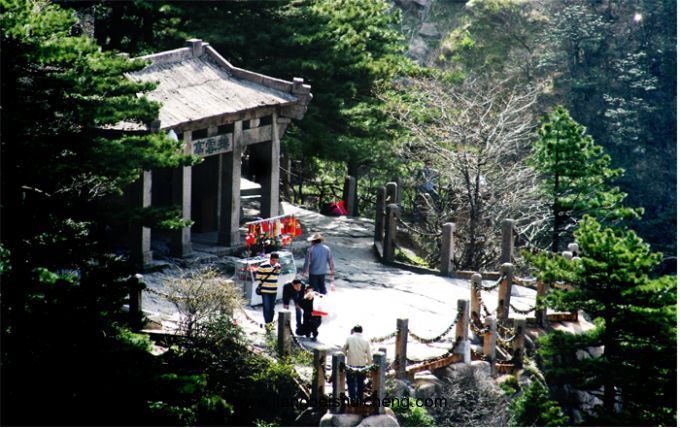 從飛來石往北走1公里,即是排云亭。排云亭位于西海門,建于民國24年。這里視野開闊,是觀賞黃山巧石奇景的最佳地點。因為西海時有云霧在山谷中升騰翻滾,撲至石亭前卻又消散,故名“排云亭”。