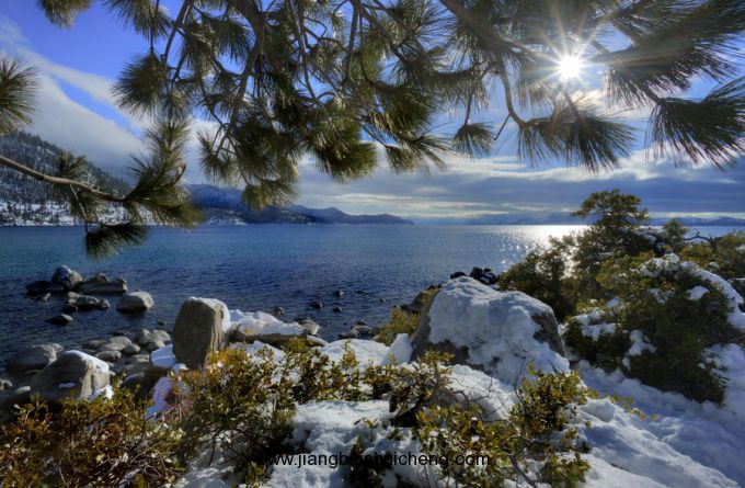 太浩湖是位于美國加州與內(nèi)華達(dá)州之間的高山湖泊,海拔6225 尺,22 哩長、12 哩寬,并有 72 哩長的湖岸,四周由山峰環(huán)抱,湖水澄凈湛藍(lán),冬天降雪期長達(dá) 8 個(gè)月,路面經(jīng)常積雪盈尺,但湖底異常的深,最深處達(dá)1645尺,湖水卻不會(huì)結(jié)冰。