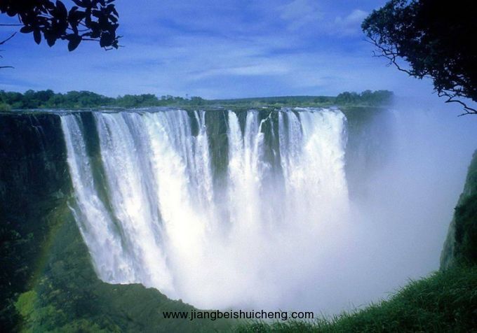 觀賞大瀑布,從盧薩卡出發(fā),可以駕車或乘飛機(jī)去。乘游艇暢游大瀑布的上游——贊比西河。從上游可以看到瀑布的輪廓。贊比西河是非洲第四長河,流向從西向東,南岸是津巴布韋,北岸是贊比亞。河面很寬,但水流平緩。河中有一小島,用望遠(yuǎn)鏡可看到島上徜徉的一群群大象。突然聽到隆隆的響聲,顯然是游艇已接近瀑布。在盛水期,你從幾里甚至幾十里開外,就能看到瀑布激起的沖天水柱,一團(tuán)團(tuán)不斷向上翻涌,在藍(lán)天白云間飄散開去。當(dāng)?shù)胤Q該瀑布為“莫西奧圖尼亞”,意思是“雷鳴之煙”。維多利亞瀑布最寬處達(dá)1690米。河流跌落處的懸崖對面又是一道懸崖,兩者相隔僅75米。水在這里形成一個(gè)名為“沸騰鍋”的巨大旋渦,然后順著72千米長的峽谷流去。