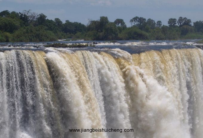 非洲第四大河的贊比西河滾滾流到這里,在寬約1800米的峭壁上驟然翻身,萬頃銀濤整個(gè)跌入約110米深的峽谷中,卷起千堆雪,萬重霧,只見雪浪騰翻,湍流怒涌,萬雷轟鳴,動(dòng)地驚天,濺起的白色水霧,有如片片白云和輕煙在空中繚繞,巨響和飛霧可遠(yuǎn)及15公里。