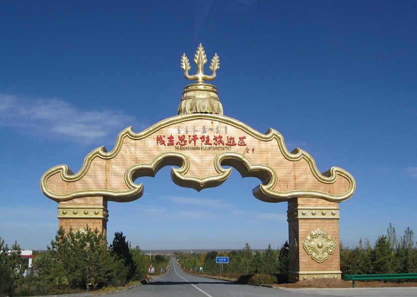 距成吉思汗陵園東西1公里,又有成吉思汗敖爾敦(行宮),這是仿照成吉思汗1206年即大汗位時的行宮布局而建造的,人們又叫它“元代村”。行宮由迎賓牌樓、大宮門、金頂大帳、左右側(cè)展、選汗高臺、射獵場、賽馬場等部分組成。