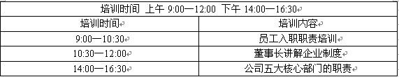 培訓(xùn)時(shí)間一天,內(nèi)容包括:辦公室、財(cái)務(wù)、網(wǎng)絡(luò)、客服、業(yè)務(wù)(計(jì)調(diào)、前臺(tái)、導(dǎo)游)培訓(xùn),企業(yè)制度培訓(xùn)等。上午是《聊之旅員工入職職責(zé)》的培訓(xùn),從員工試用期開始到正式簽訂工作協(xié)議,對(duì)職業(yè)準(zhǔn)則以及員工行為準(zhǔn)則都進(jìn)行了詳細(xì)地說明,員工所關(guān)心的的薪酬問題、績效問題也在文件中提及。