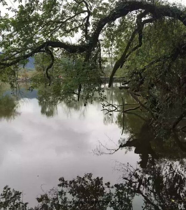 宏村的池塘,水平如鏡,波光鑠金,蕩漾著四周古民居的倒影:粉墻、黛瓦、馬頭墻、藍(lán)天白云.....,在 池塘邊,婦女在浣洗,兒童在戲耍,偶而有人從旁走過,向池塘撒下一片笑聲。