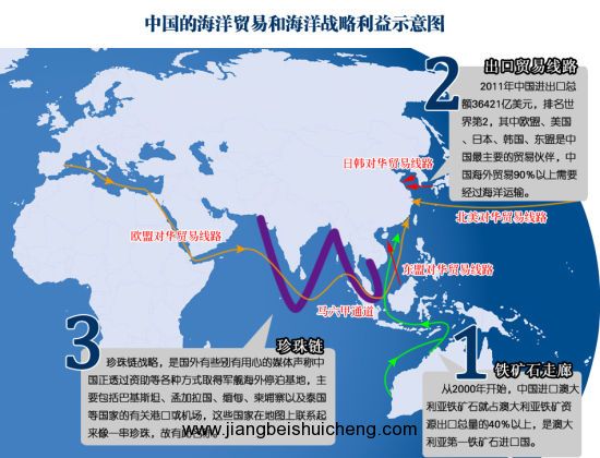 印度洋是中國重要的國際貿(mào)易通道和能源通道。首先是能源安全。自1993年中國成為石油凈進(jìn)口國,截至2009年,中國已成為僅次于美國和日本的第三大石油進(jìn)口國,進(jìn)口量超過2億噸,日均超過380萬桶,已占整個石油需求量的60%,未來的需求量還會繼續(xù)攀升,而國內(nèi)產(chǎn)量到2020年將開始下降。據(jù)羅伯特??ㄆ仗m估計,到2020年中國的石油需求量將達(dá)到日均730萬桶。目前中國石油進(jìn)口量的80%來自中東和非洲,經(jīng)印度洋和馬六甲海峽等通道運至中國。雖然中國也在積極爭取石油進(jìn)口多元化,但原油儲量占世界60%、天然氣儲量占世界35%的印度洋地區(qū)仍是中國最可靠的石油進(jìn)口地區(qū),到2020年超過85%的石油進(jìn)口量要走印度洋航線,印度洋和馬六甲海峽地區(qū)的安全影響著這條事關(guān)中國經(jīng)濟(jì)命脈的“海上生命線”,因此被稱為中國的“馬六甲困局”。由于中國奉行和平發(fā)展戰(zhàn)略及限于自己的海軍力量,在非和平時期,中國對保障這條“海上生命線”還存在很大的困難。據(jù)統(tǒng)計,中國現(xiàn)在的戰(zhàn)略石油儲備量不足30天,而國際能源署建議的儲備標(biāo)準(zhǔn)是90天,美國和日本等國的儲備量超過160天,其他發(fā)達(dá)大國也遠(yuǎn)超90天。一旦爆發(fā)危機(jī),中國就有可能受制于人。同時,印度洋地區(qū)沿岸國家大都屬于礦產(chǎn)資源豐富的欠發(fā)達(dá)國家,由于技術(shù)和資金短缺,這些礦產(chǎn)資源基本上屬于未開發(fā)、半開發(fā)或開發(fā)水平不高的狀態(tài)。隨著中國國內(nèi)資源的日益枯竭,印度洋地區(qū)的各種礦產(chǎn)資源,如銅、鋰、鈹、鎳、鈷及磷酸鹽等都是中國現(xiàn)在或未來所需的,因此中國有必要與這些國家合作以保證印度洋航線的安全。