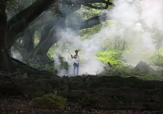靜靜地等待一會(huì)兒,太陽(yáng)出來(lái)了,拍攝時(shí)機(jī)成熟。老王開(kāi)始招呼他的助理——另外兩個(gè)村民,在榕樹(shù)后面開(kāi)始放煙餅。