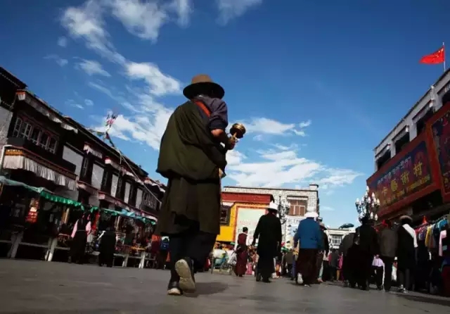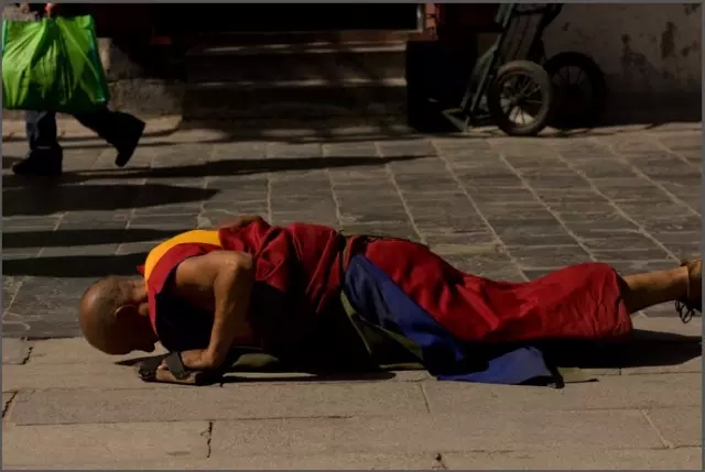 八廊街被藏族人稱為圣路,因此有許多磕長(zhǎng)頭的佛教信徒活躍于此,許多信徒也愿意成為攝影師們的擺拍模特。
