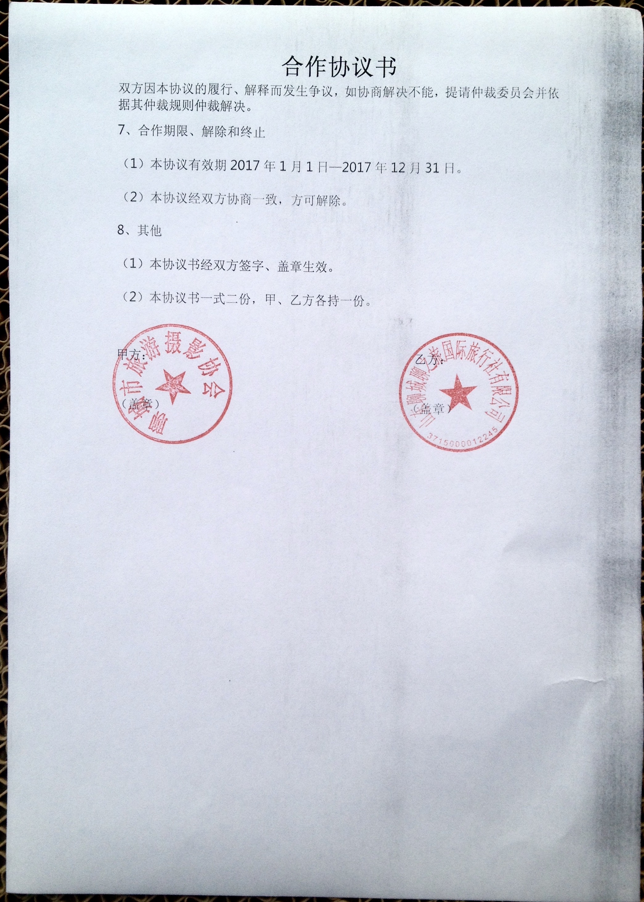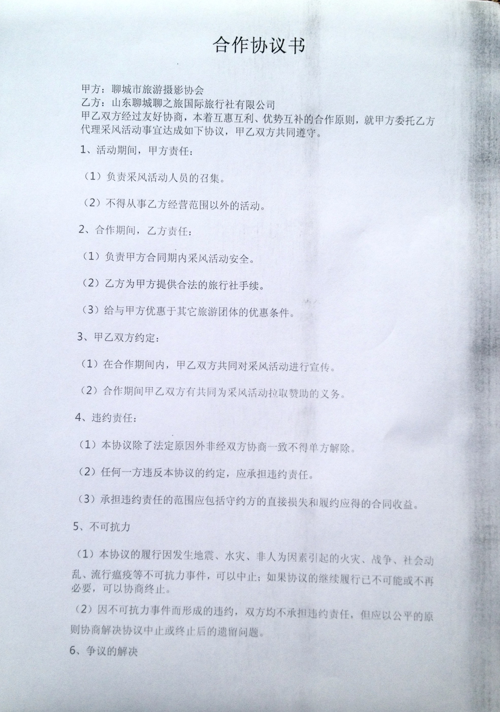 為響應國家政策號召,聊城市旅游攝影協(xié)會委托山東聊城聊之旅國際旅行社有限公司代理采風活動事宜,雙方經(jīng)過友好協(xié)商,本著互惠互利、優(yōu)勢互補的合作原則,達成以下協(xié)議。