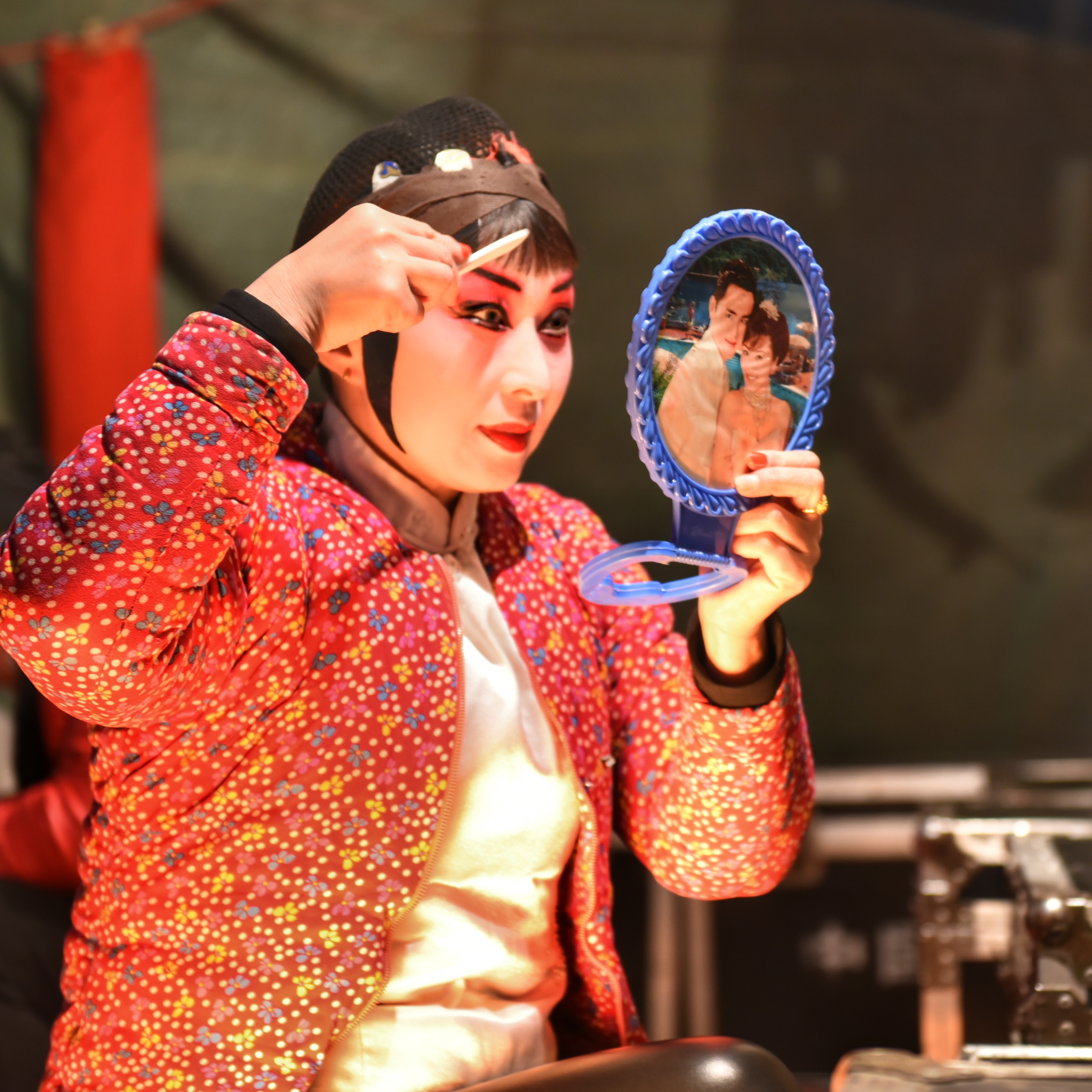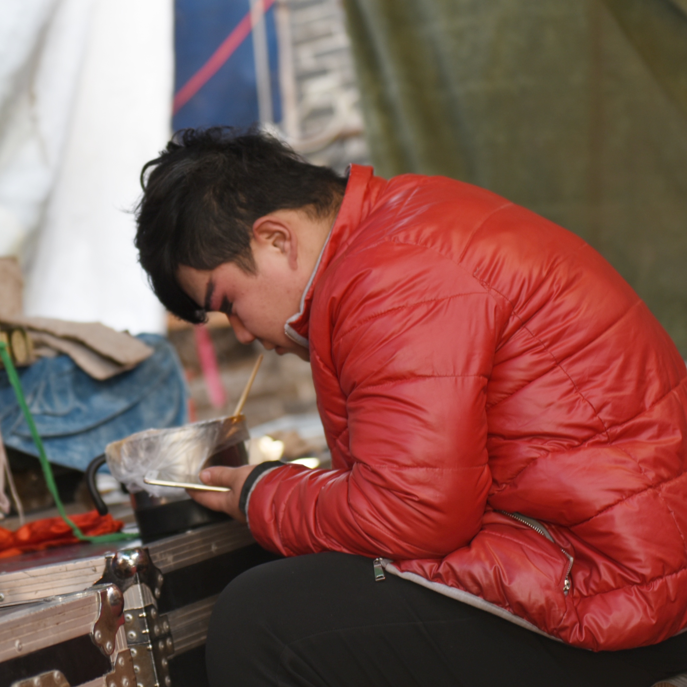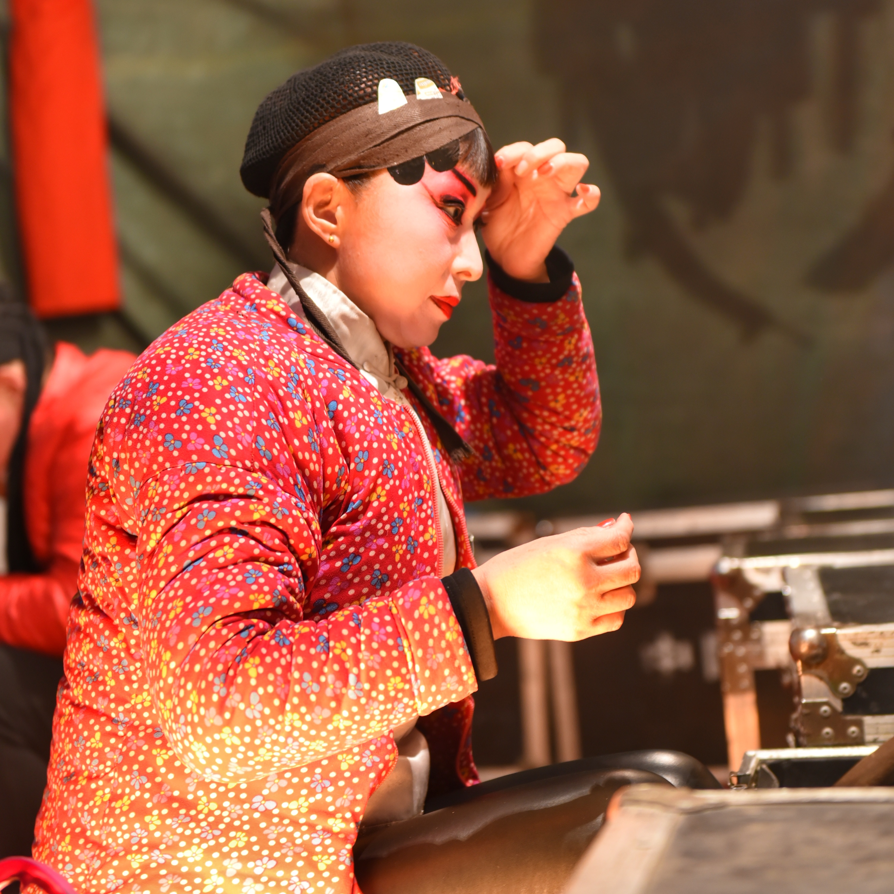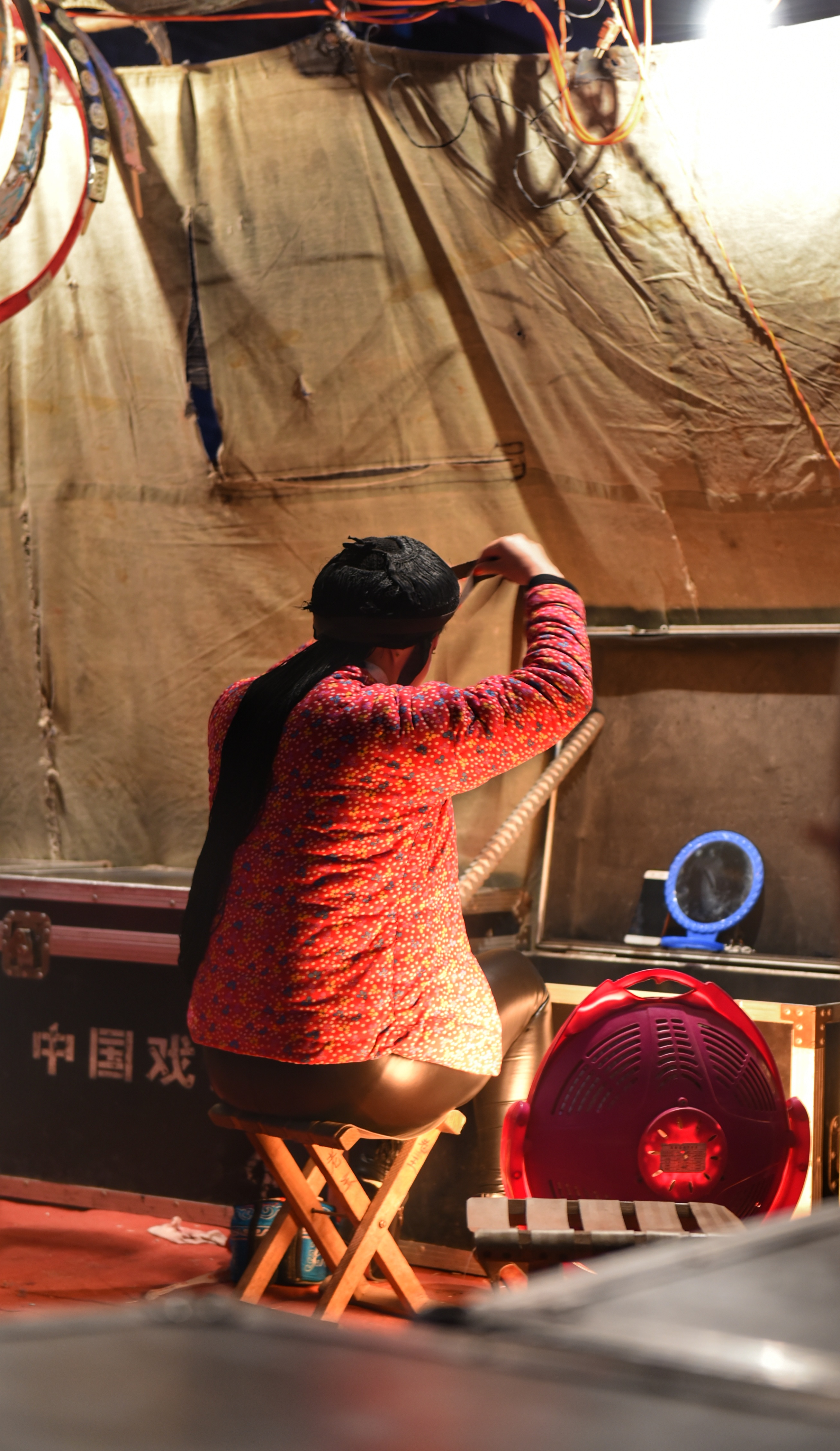 童年的記憶中我們這些頑皮的孩子,也不會(huì)依偎在父母的身旁去看、去聽(tīng)自己不懂的戲曲,忙碌的后臺(tái)倒是吸引著我們的好奇心,演員的化妝、上臺(tái)前的準(zhǔn)備、五顏綠色的戲服、一張張的大花臉,都是那么的新奇、好玩。當(dāng)然此刻的我們還是那么的好奇,只是現(xiàn)在的手中多了一部單反。