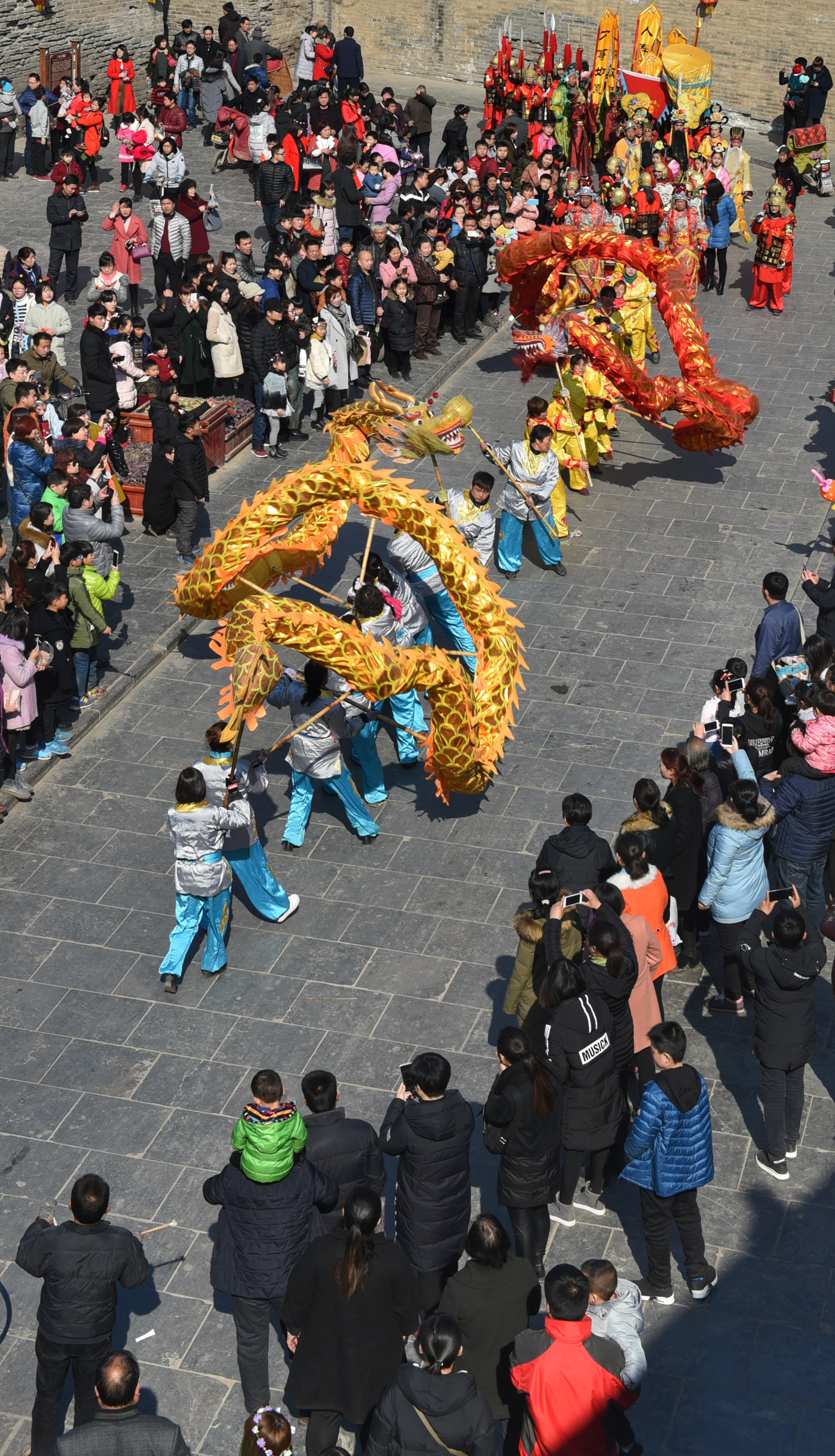 正徜徉在大街上的時(shí)候,被一陣鑼鼓聲吸引到了東門(mén),原來(lái)是舞龍的隊(duì)伍,兩條巨龍?jiān)阼尮穆曋猩舷买v飛,舞出了一番盛世景象。