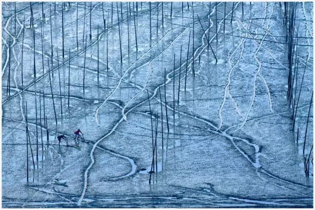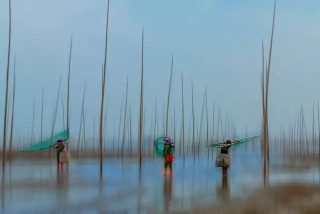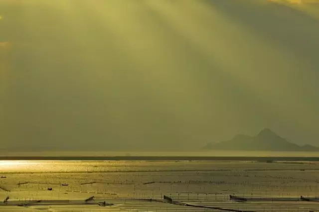 霞浦灘涂上以大面積的灰色為主,上面用于養(yǎng)殖的竹竿反光極為強(qiáng)烈,為了突出光影的效果,這些反光只能駕馭無法消除。可以考慮拍攝減少曝光量來進(jìn)行控制畫面的主體明度,達(dá)到增強(qiáng)光影效果的目的。選擇日落日出時(shí)段拍攝,化不利為有利。此時(shí)竹竿上的光比小,色溫暖,竹竿被夕陽染成了金色,為灘涂風(fēng)光造景造勢(shì)。曝光控制值要講究,如果對(duì)高光部位正確曝光,舍去暗部的細(xì)節(jié),得考慮到灘涂的竹竿在遠(yuǎn)處成像后非常細(xì)小,即使使用相機(jī)的點(diǎn)測(cè)光也無法測(cè)出高光部分的亮度,那 么只能使用評(píng)價(jià)測(cè)光來測(cè)量。曝光補(bǔ)償上減少2檔曝光。