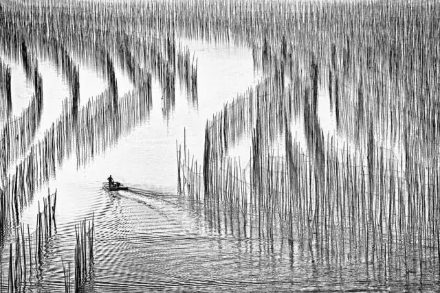 去霞浦拍攝時(shí),不一定會(huì)遇到好的天氣,遇到陰天時(shí)是不是就不拍照了呢? 陰天依然可以捕捉灘涂美景,不過需要把拍攝模式轉(zhuǎn)為黑白,主要表現(xiàn)灘涂中的漁網(wǎng)漁船等物體的線條,與海水形成黑白剪影的效果。