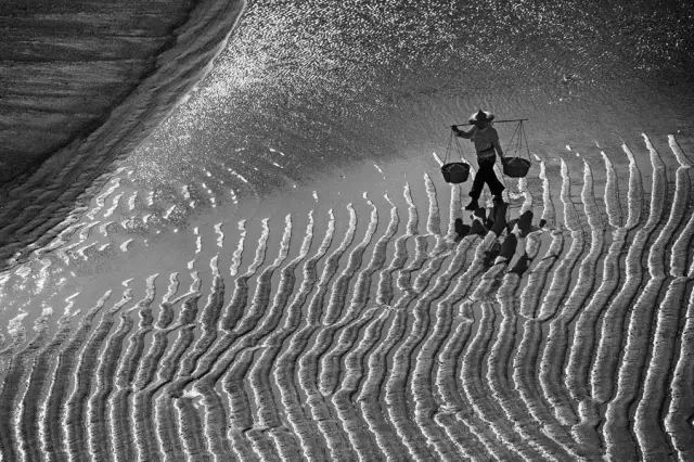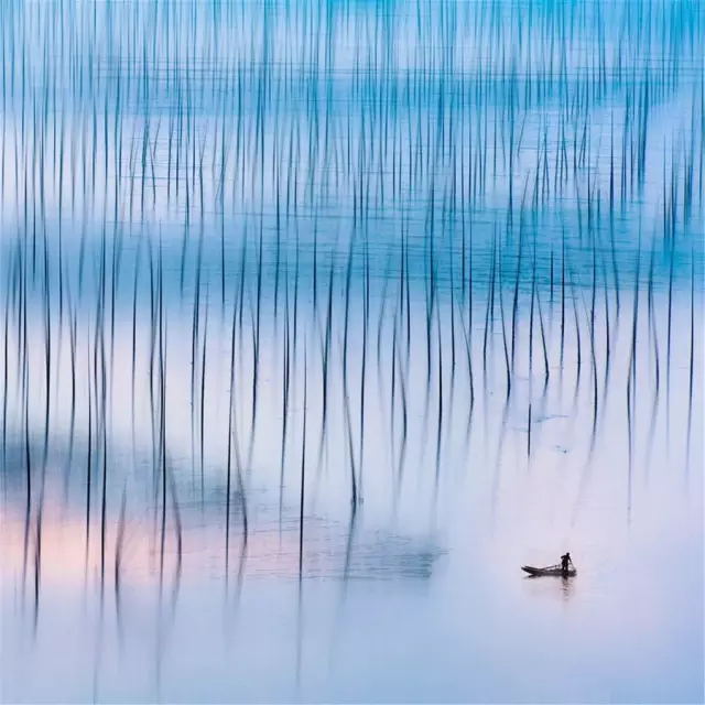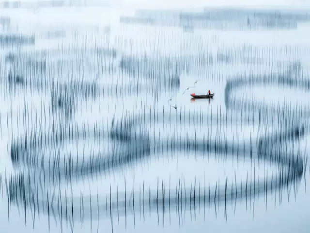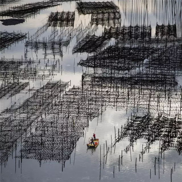 霞浦灘涂大面積的海上養(yǎng)殖,為灘涂添加了線條和規(guī)則的幾何圖案,可以利用這些圖案組成單一節(jié)奏感很強(qiáng)的畫面。