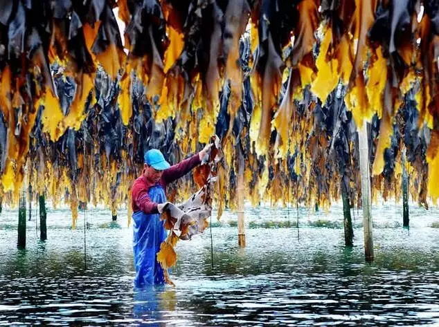 還有曬海帶,適合用中焦進(jìn)行近景拍攝,這樣能夠體現(xiàn)出曬海帶的過程,和曬海帶的壯觀景象,并可以在日落前運(yùn)用逆光拍攝,逆光可以表現(xiàn)出海帶的通透質(zhì)感。