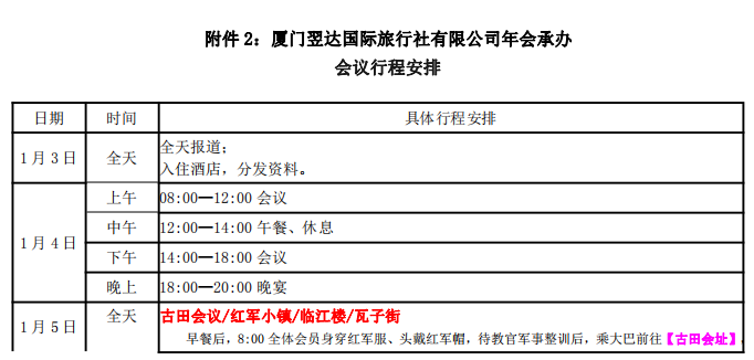 2、會議時間:2019 年 1 月 3 日→6 日。其中 3 號報到,4 號年會會議,5、6、號(6 號下午 5 點結(jié)束行程考察,不含 6 號晚餐及 6 號晚住宿)古田會議經(jīng)典路線考察(含古田會址、中復(fù)村、松毛嶺等)。