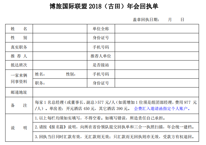 3、參會單位須如實填報《博旅國際聯(lián)盟 2018 年會回執(zhí)單》,連同年會匯款回單截圖按指定發(fā)送確認(rèn)(下詳)。