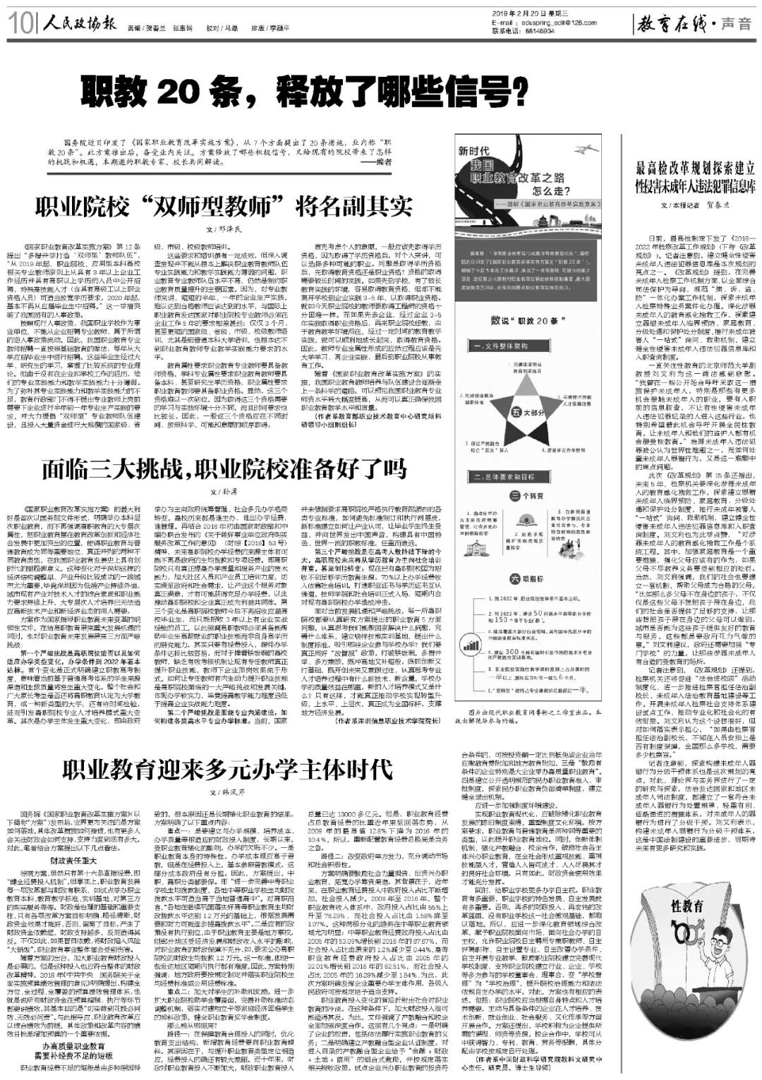 面對當(dāng)前發(fā)展機(jī)遇和嚴(yán)峻挑戰(zhàn),每一所高職院校都要認(rèn)真研究方案提出的職業(yè)教育5方面問題,認(rèn)真思考我們能幫國家解決什么問題,完善什么體系,建立啥樣技能實(shí)訓(xùn)基地,提出什么制度標(biāo)準(zhǔn),吸引哪些企業(yè)參與學(xué)校辦學(xué)?我們要真正用好“放管服”政策,打破鐵飯碗,多措并舉、多方兼顧,既沖高地又補(bǔ)短板,既抓創(chuàng)新又打基礎(chǔ),既開創(chuàng)未來又兼顧過往,認(rèn)真思考專業(yè)人才培養(yǎng)過程中有什么新技術(shù)、新含量,學(xué)校辦學(xué)的質(zhì)量效益在哪里,新的人才培養(yǎng)模式又是什么?只有這樣,才能真正推動(dòng)學(xué)校實(shí)現(xiàn)轉(zhuǎn)型升級,上水平、上層次,真正成為全國標(biāo)桿,支撐地方經(jīng)濟(jì)發(fā)展。(作者系深圳信息職業(yè)技術(shù)學(xué)院院長)