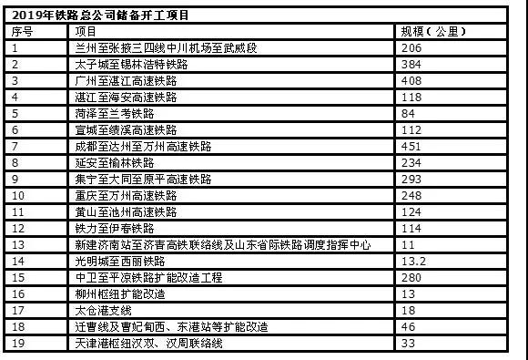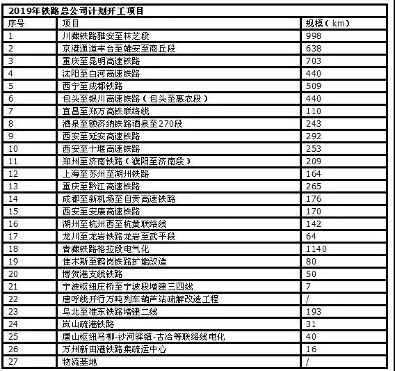 表一:2019年鐵路總公司計劃開工項目