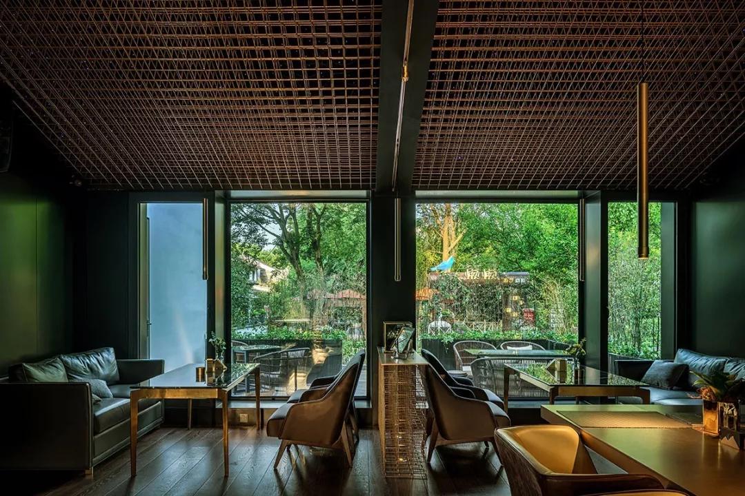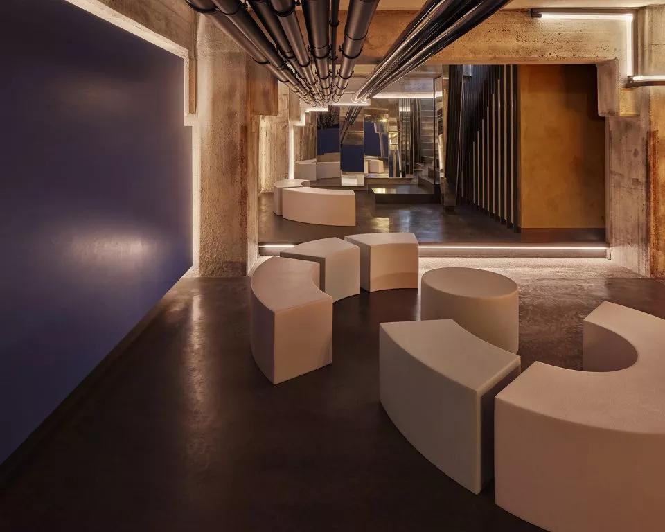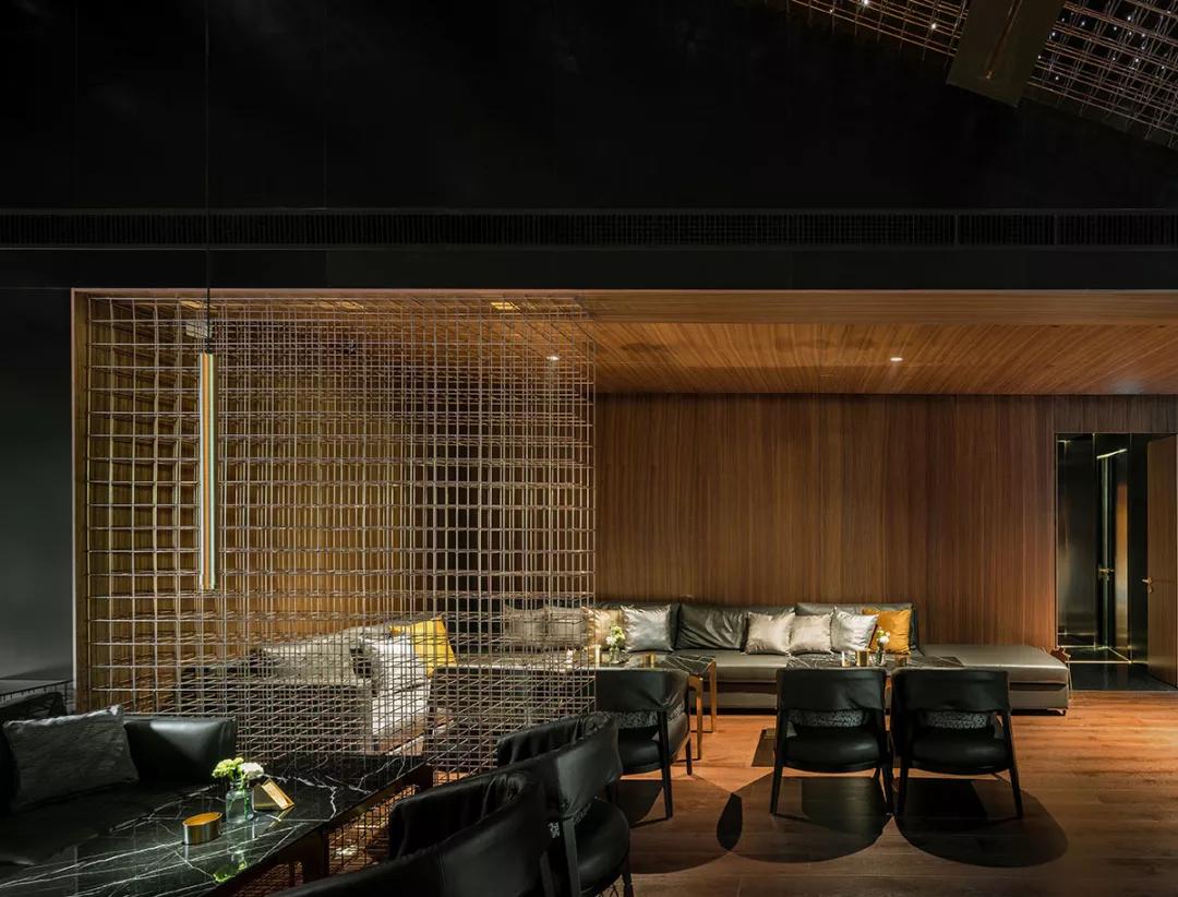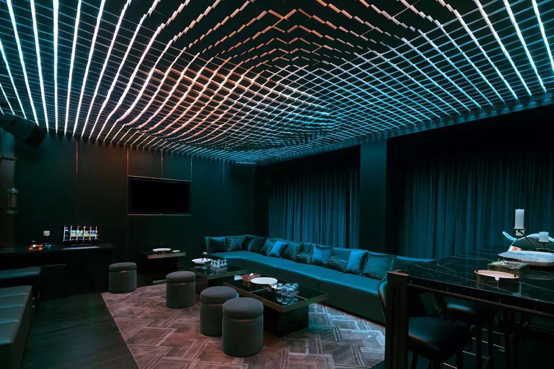 酒吧區(qū)域是一個(gè)動(dòng)態(tài)空間,室內(nèi)的現(xiàn)代化裝飾則與外界古色古香的建筑群形成強(qiáng)烈對(duì)比,數(shù)字化設(shè)計(jì)的黃銅立體網(wǎng)格結(jié)構(gòu)貫穿室內(nèi),將酒吧的各個(gè)空間串聯(lián)在一起。延伸的吧臺(tái)、舞動(dòng)的頂面、變換的星空頂燈制造出不同的視覺(jué)感受,引導(dǎo)人逐個(gè)探索每一個(gè)角落。酒吧區(qū)沒(méi)有采用尋常酒吧中常見(jiàn)的電視、投影設(shè)備以最大程度減少對(duì)人的擾動(dòng),營(yíng)造一個(gè)可以靜思、可以真正意義上產(chǎn)生思想碰撞的空間。KTV舞動(dòng)的頂面造型設(shè)計(jì)以數(shù)字矩陣為靈感,也是虛擬未來(lái)的象征。不同模式的燈光演繹讓音樂(lè)在這有了實(shí)體的呈現(xiàn)方式,音樂(lè)的流動(dòng)可以被視覺(jué)捕捉,活躍了整體空間的同時(shí)也增加了多感官交流。