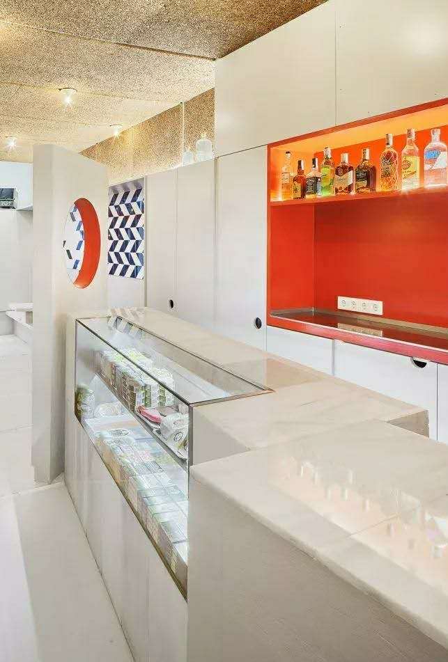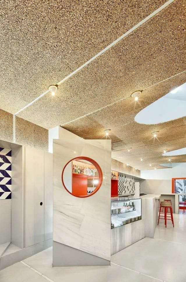 考慮到公共場(chǎng)所的聲學(xué)要求,室內(nèi)天花板和部分側(cè)面已經(jīng)覆蓋了軟木面板,這是一種吸音材料,因此可以避免混響,也可以減少對(duì)鄰居的干擾。軟木飾面的塑料品質(zhì)被用作建筑的主要裝飾主題。這種材料其切割產(chǎn)生的條紋在原處和放置天花板的地方制造出韻律感,使得燈泡看起來(lái)像是懸浮著。在這個(gè)天花板上制作了一系列凹洞,突出了內(nèi)部的節(jié)奏,并尋求一種自然天頂照明的感覺(jué)。大部分的墻壁都有輔助工作條,與內(nèi)襯藍(lán)白相間的斜面瓷磚和白色瓷磚相一致。折疊屏風(fēng)、吧臺(tái)、高腳椅和桌子,每一種元素的奇異性賦予酒吧每個(gè)部分不同的性質(zhì),為尋找不同風(fēng)格座位的顧客創(chuàng)造不同的氛圍。