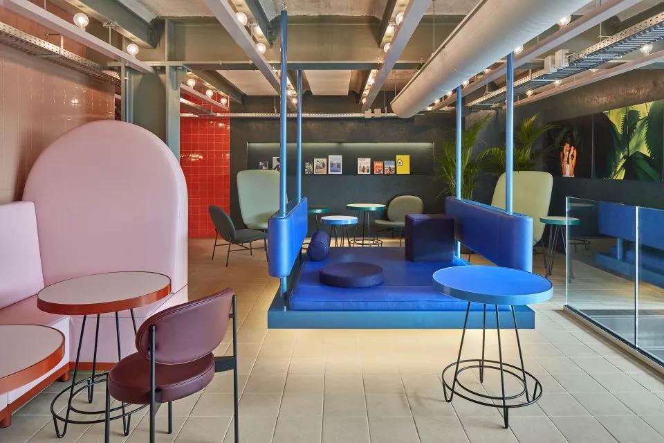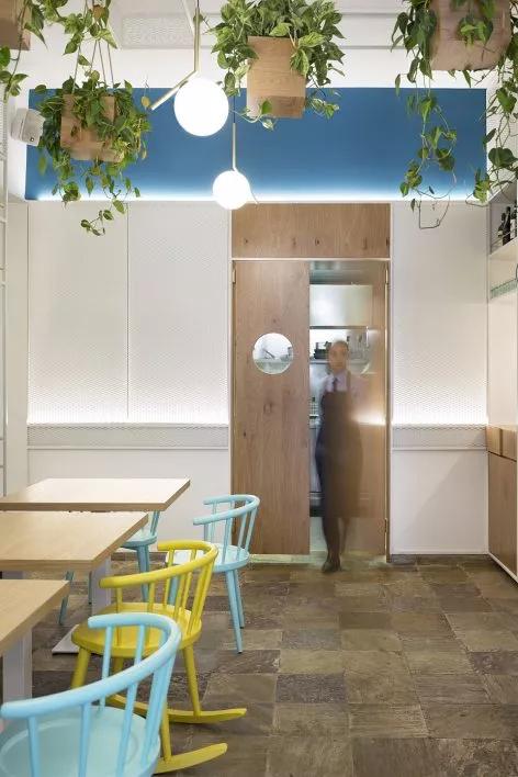 室內(nèi)的定制家具和精致的配色方案受到了陶瓷生產(chǎn)過(guò)程的啟發(fā):空間中的藍(lán)色、灰色、粉紅色和黃色涂料呼應(yīng)了生產(chǎn)工藝的開(kāi)端,利用水和黏土塑造出類似于陶器模具的體量。陶器模具的形狀以及用于生產(chǎn)陶器的工具被再次利用,成為造型獨(dú)特的工業(yè)吊燈,并將室內(nèi)空間劃分為不同的區(qū)域。堅(jiān)硬的幾何形狀與柔軟黏土塑造出的形體共同構(gòu)成了大膽而和諧的內(nèi)部空間。
