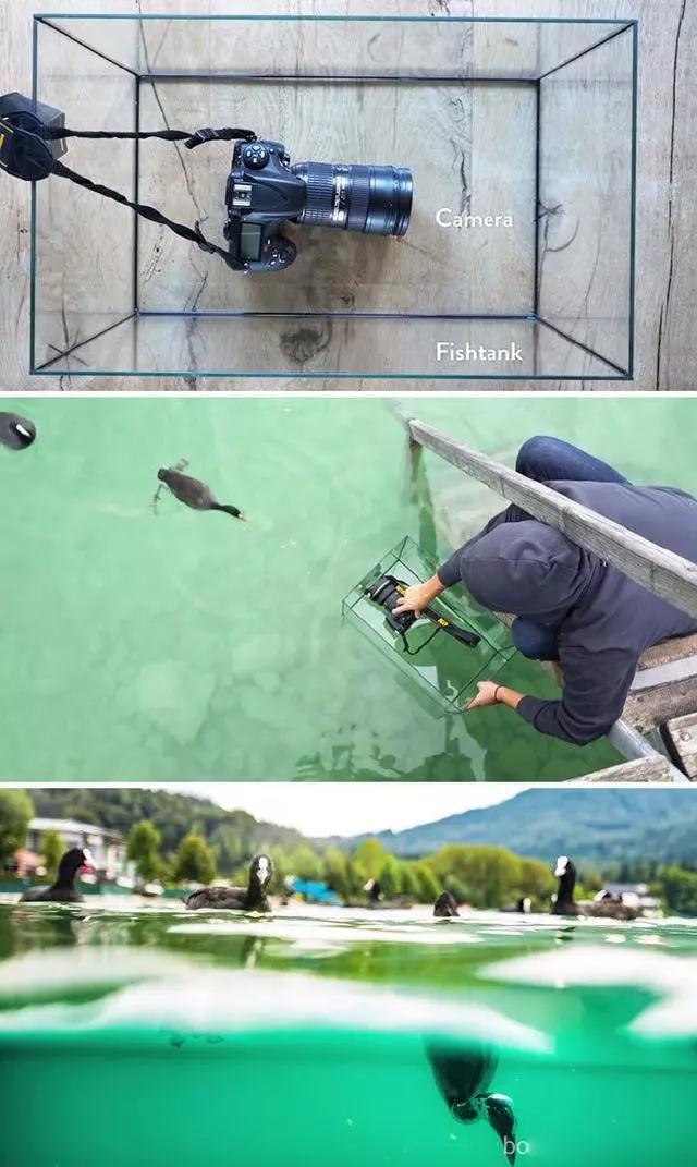 把相機(jī)放進(jìn)一個(gè)玻璃盒子里可以拍出水上水下的畫(huà)面,同理手機(jī)放進(jìn)深玻璃杯也是可以的。