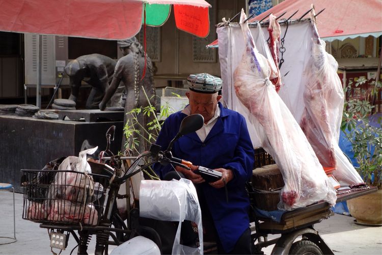 賣羊肉的流動攤販。當(dāng)?shù)氐难蛉鈨r(jià)格和我們家鄉(xiāng)差不多,30多元一斤,不過都是帶著骨頭的,好大好肥的羊肉耶。導(dǎo)游是濟(jì)南人,他每次回家探親都買很多的羊肉用保鮮箱發(fā)回家。