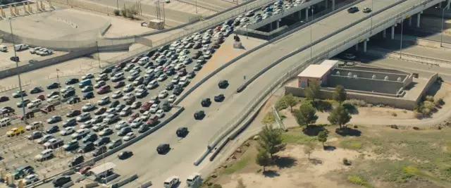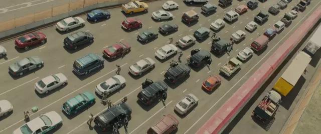AC:電影前20分鐘是一段非常有沖擊力的片段,Emily Blunt飾演的角色和她的隊(duì)伍開進(jìn)華雷斯(邊境城市)。這個片段里混合航拍鏡頭和在車上的鏡頭,展現(xiàn)他們越過邊境