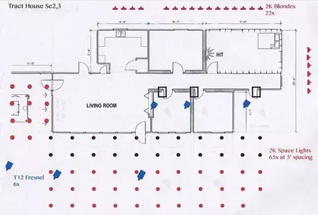 Deakins: 我的圖只是粗略的設(shè)計(jì),只是用來和我的燈光師溝通,看哪里需要什么燈。T12和天空燈是事先安裝好的,但這些燈不是用來照演員臉的,T12沒法照那么遠(yuǎn)。