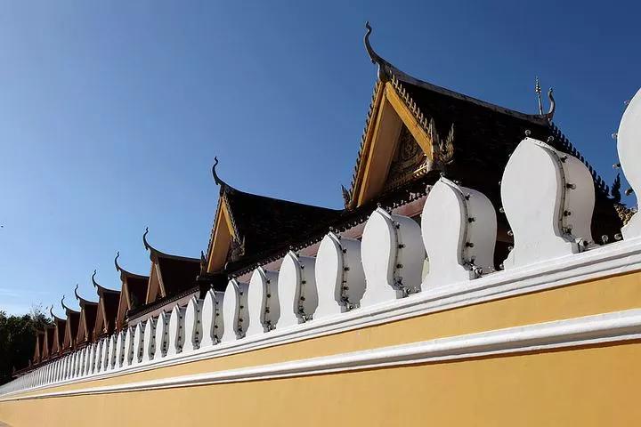 金邊皇宮是諾羅敦國王于1866-1870年建造的,充滿高棉傳統(tǒng)建筑風(fēng)格和宗教色彩?;蕦m由一組金色屋頂、黃墻環(huán)繞的建筑組成,造型精美,金碧輝煌。