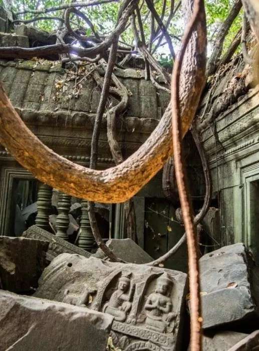崩密列是吳哥窟公認(rèn)最神秘的寺廟,崩密列的歷史還處于不明狀態(tài),據(jù)學(xué)者推測(cè)大約建造于 11 世紀(jì)末至 12 世紀(jì)初,宮崎駿電影《天空之城》的原型,古寺搭配樹木、青苔、落葉建構(gòu)出唯美的意象。整個(gè)寺廟嚴(yán)重崩塌,石頭落了一地沒(méi)有任何保護(hù),感覺(jué)人人都可以撿走,被叢林層層覆蓋千年,各種被封死的的門,似乎里面隱藏著大秘密。