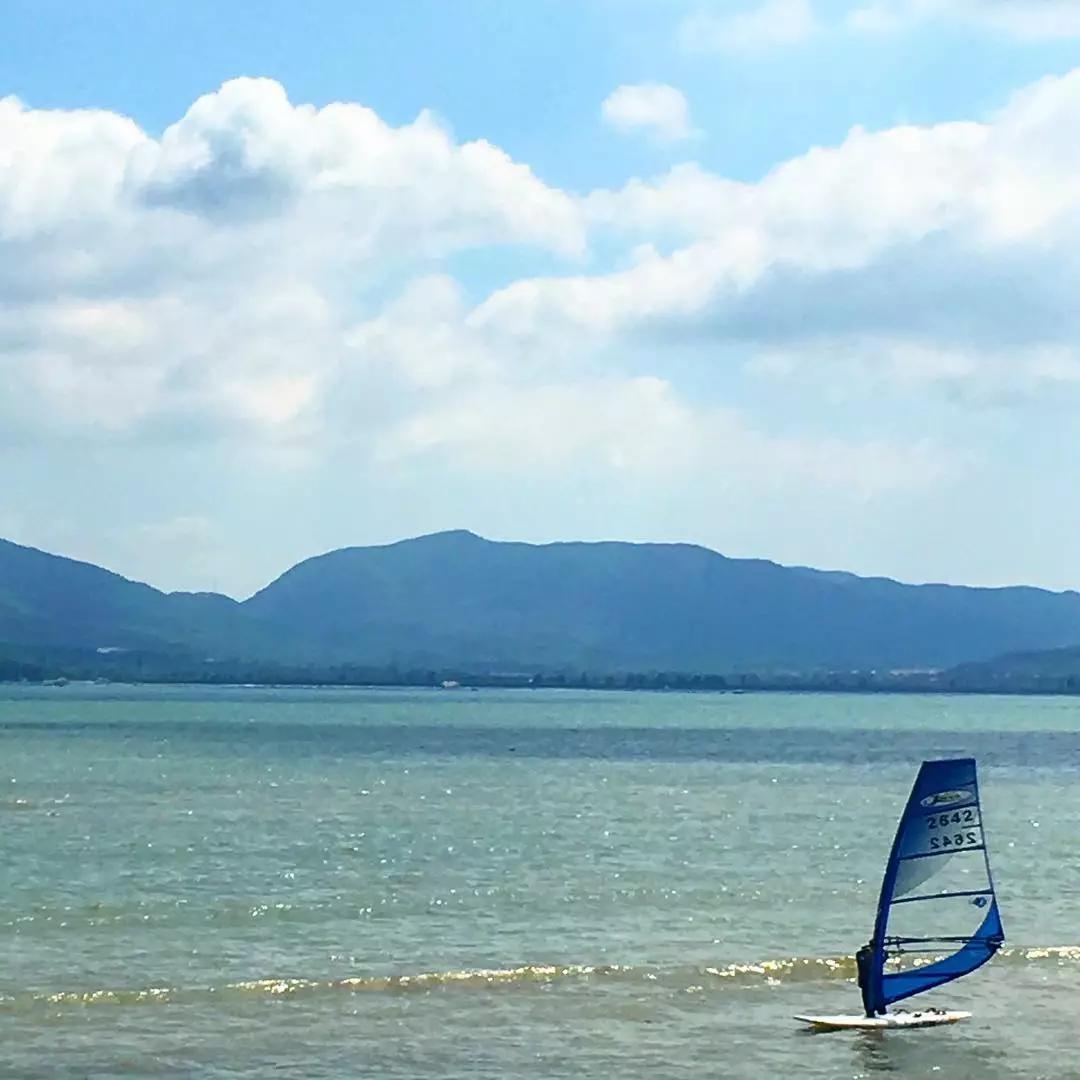較場尾是內(nèi)海,浪比較小,每年的9月份開始起風(fēng),很適合玩風(fēng)箏沖浪之類的項目。還有現(xiàn)在很流行的空中飛人,在較場尾也有得玩,還配有專業(yè)教練一對一教學(xué)。