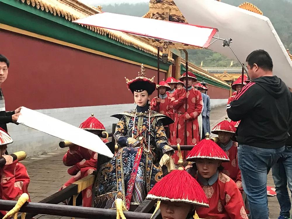 左下方這塊反光板,是用來減小鼻頭下面,眼眶下面,下巴下面的陰影的。上面那塊紅色邊的柔光片,是用來讓天光又能穿過,又能變得柔和你。后邊那塊大型的,是弱弱地給魏瓔珞一個逆光光邊,讓她區(qū)別于背景的。
