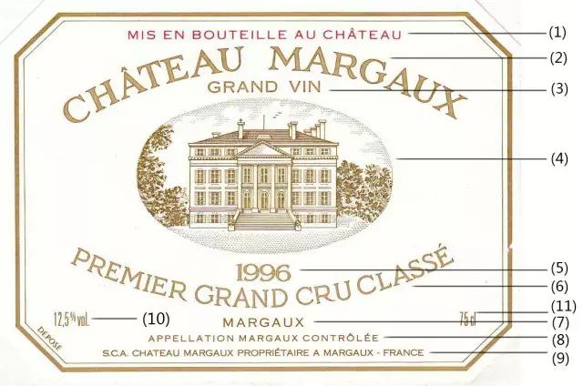 主要包含信息:(1)裝瓶地點(diǎn) (2)酒莊名稱 (3)優(yōu)質(zhì)葡萄酒 (4)酒標(biāo)圖案 (5)葡萄采摘年份 (6)酒莊等級(jí) (7)子產(chǎn)區(qū)名 (8)原產(chǎn)地控制命名 (9)生產(chǎn)商 (10)酒精度 (11)容量