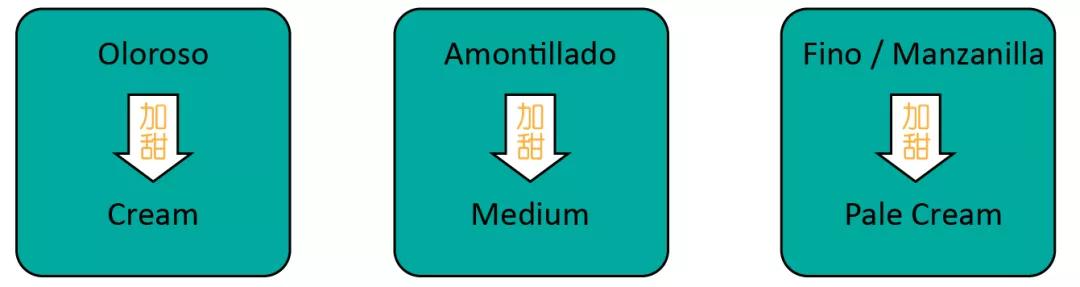 最后,不管是Fino, Oloroso還是Amontillado都是干型雪莉。酒莊也可以把它們加甜,用的是濃縮的葡萄汁,或者PX和Muscat of Alexandria釀成的甜雪莉。