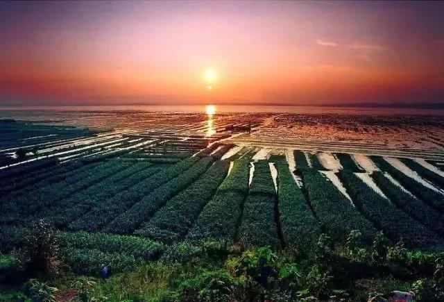 傍晚時(shí)分,林木茂密,水天一色,翠峰鵠立,湖中白帆點(diǎn)點(diǎn),波光粼粼,一片寧靜淡泊的世外桃源景象。