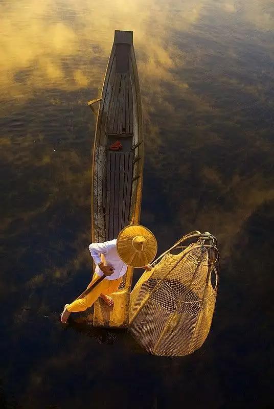 夕陽(yáng)西下,頭戴斗笠的漁民,一手拿捕魚的簍子,一手拿著船槳,準(zhǔn)備上岸回家吃晚飯。