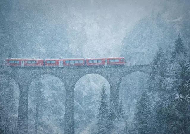 瑞士下了一場(chǎng)大暴雪,火車迎著暴雪,在橋上艱難地前行著,猶如童話中的場(chǎng)景。