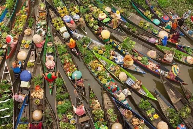 在泰國(guó),菜市場(chǎng)不在地上而在水中,各種新鮮的水果和蔬菜被放在一條條狹窄瘦長(zhǎng)的小木船上進(jìn)行售賣。顧客買東西很有意思:要從這條船上跨到另外一條船上。