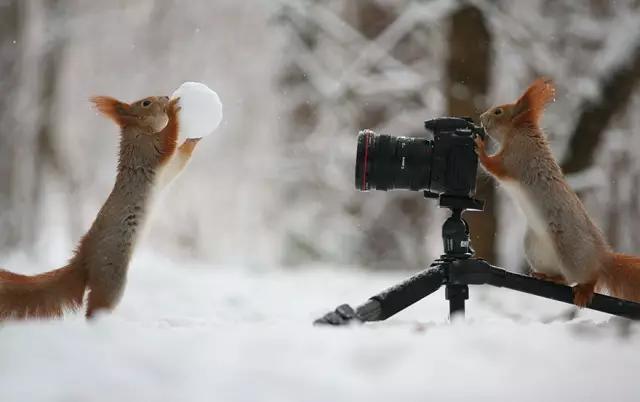 兩只小松鼠,一個(gè)當(dāng)模特,一個(gè)當(dāng)攝影師在雪中拍照,可愛到爆!