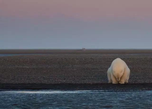因?yàn)槿驓夂蜃兣?,冰雪融化,一只北極熊孤獨(dú)地蹲在岸邊,無(wú)家可歸。