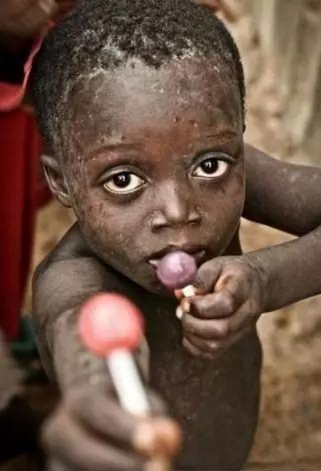 這是非洲難民區(qū)的一個(gè)孩子,常年忍饑挨餓,他有幸得到兩個(gè)棒棒糖,卻依然堅(jiān)持送攝像叔叔一個(gè)棒棒糖。