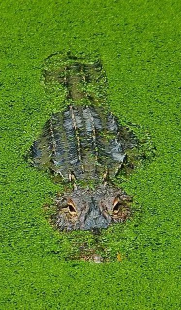 躲在綠色的海藻中,只漏出眼睛和背部的鱷魚正全神貫注等待自己獵物的到來(lái)。